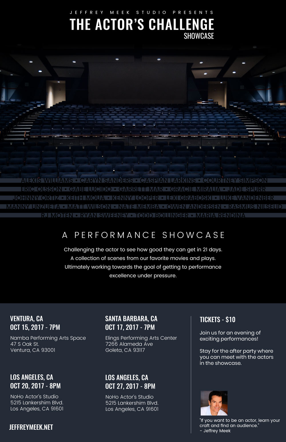 The Actor’s Challenge is designed to guide the apprenticed performer into the arena of professionalism in a safe, loving and compassionate environment. The actors learn to build strength in the areas of focus, courage, poise, self-confidence and resilience – a real sense of worthiness, not easily attained in a traditional acting class. One of the greatest challenges for an actor is overcoming the fear of being seen in their work by those closest to them – their friends and family. The Actor’s Challenge Showcase gives the actors an opportunity to ask loved ones and respected professionals to come see what they have been able to accomplish in their work over the past 21 days. Tickets for the performances will be sold at the door and online.
